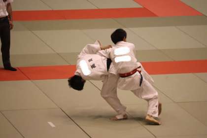 写真は、岡崎中央総合公園武道場で行われた柔道部・団体戦の大会の様子です。