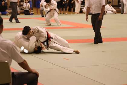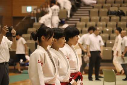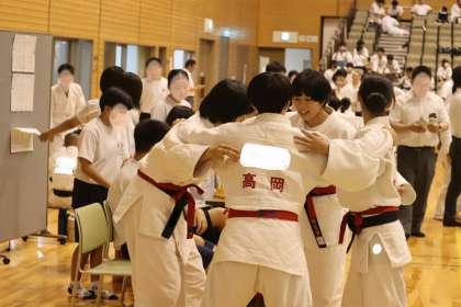 写真は、岡崎中央総合公園武道場で行われた柔道部・団体戦の大会の様子です。