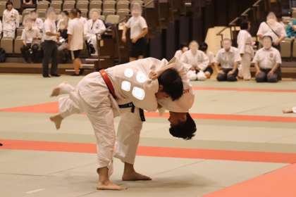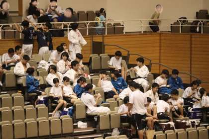 写真は、岡崎中央総合公園武道場で行われた柔道部・団体戦の大会の様子です。