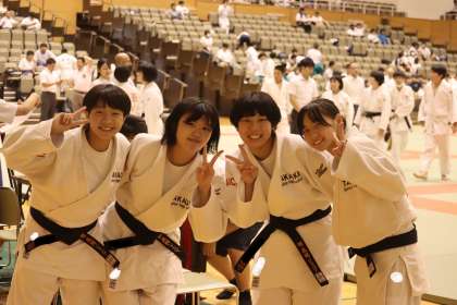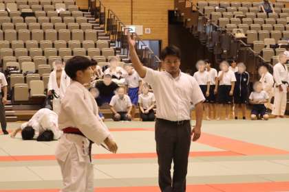 写真は、岡崎中央総合公園武道場で行われた柔道部・団体戦の大会の様子です。