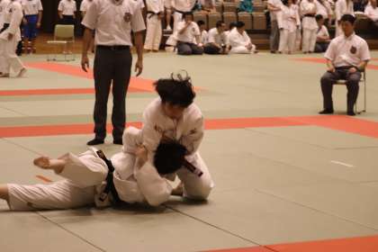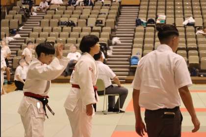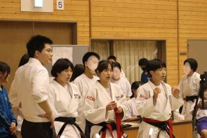 写真は、岡崎中央総合公園武道場で行われた柔道部・団体戦の大会の様子です。