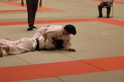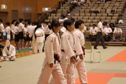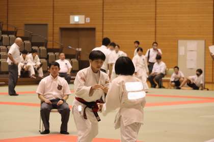 写真は、岡崎中央総合公園武道場で行われた柔道部・団体戦の大会の様子です。