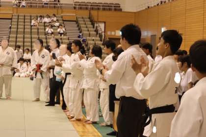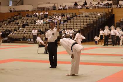 写真は、岡崎中央総合公園武道場で行われた柔道部・団体戦の大会の様子です。