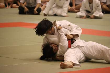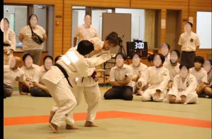 写真は、岡崎中央総合公園武道場で行われた柔道部・団体戦の大会の様子です。