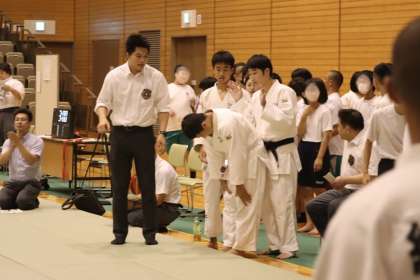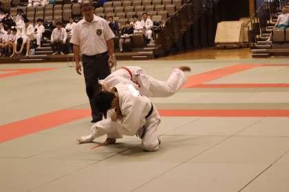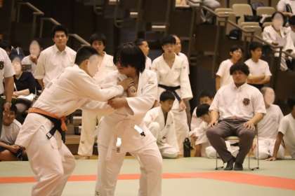 写真は、岡崎中央総合公園武道場で行われた柔道部・団体戦の大会の様子です。