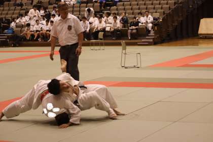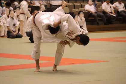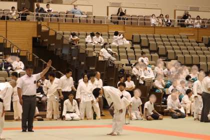 写真は、岡崎中央総合公園武道場で行われた柔道部・団体戦の大会の様子です。