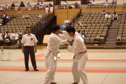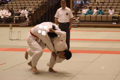 写真は、岡崎中央総合公園武道場で行われた柔道部・団体戦の大会の様子です。