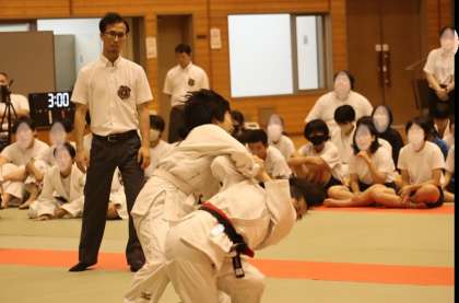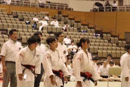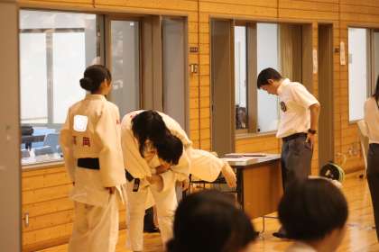写真は、岡崎中央総合公園武道場で行われた柔道部・団体戦の大会の様子です。