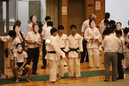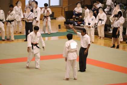 写真は、岡崎中央総合公園武道場で行われた柔道部・個人戦の大会の様子です。