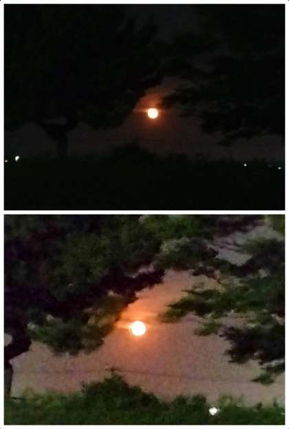 学校の駐車場から見えた昨夜の月の様子です(写真下)。日の出や夕焼けのように真っ赤に染まっていたので、思わず撮影してしまいました。