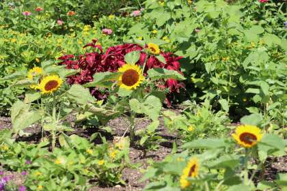 職員室前の花壇は、たくさんの草花が植えられています。中でもひときわ目立つのが、夏を象徴するヒマワリです。ここに植えられているものは丈が低い品種のもの。周りの植物とのバランスを取るためにあえてこの品種が植えられています。