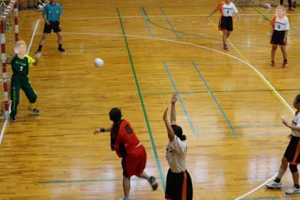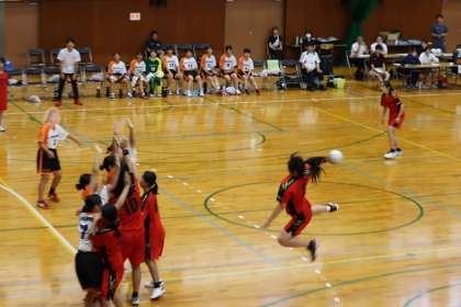 写真は、スギ薬局知立福祉アリーナで行われた女子ハンドボール部の大会の様子です。