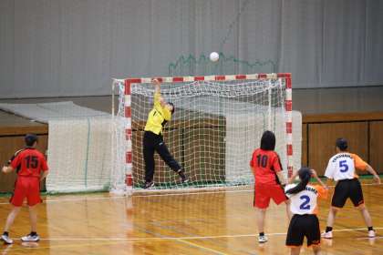 写真は、スギ薬局知立福祉アリーナで行われた女子ハンドボール部の大会の様子です。