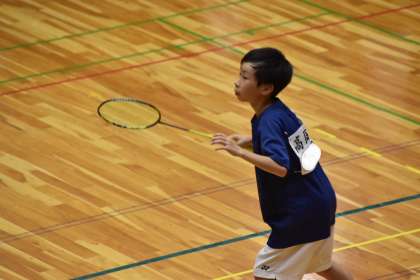 写真は、メディアス体育館おおぶで行われたバドミントンの大会の様子です。