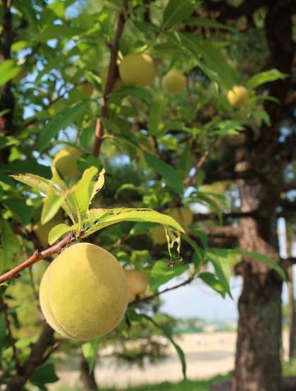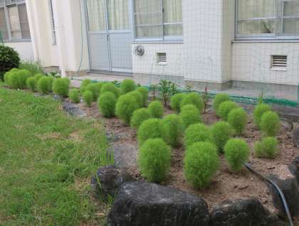 東門をくぐって正面の植え込みに植わるモモの木。暑さに耐え、今年も立派な実をつけています(写真上)。また2棟の東側の花壇では、あんなに小さかったコキアがこちらも立派に生長しています(写真下)。