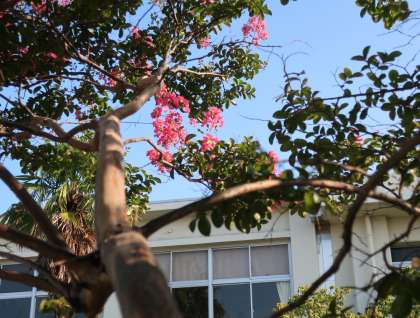 玄関前のプランターで大きくなったコキア、きれいな青空に映えるサルスベリの鮮やかなピンクの花。暑さは相変わらずですが、こうした高中の景色を見ていると心が落ち着きます。