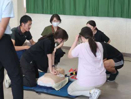 写真は、本日の午後に行われた「救命講習・シミュレーション研修」の様子です。