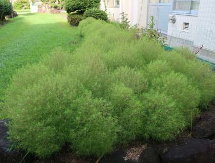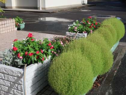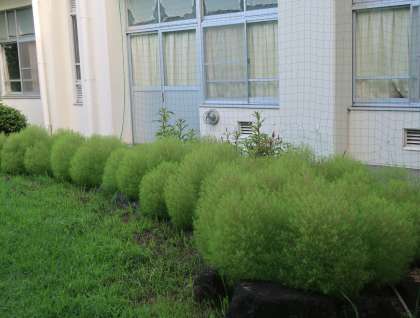 藤岡南中学校からいただいたコキア。この夏の暑さや激しい雨を乗り越え、現在ではこんなに立派に生長しています。ただ、コキアの楽しみはこれからもあります。もっと涼しくなる頃、今度は赤色に変化をしていきます。