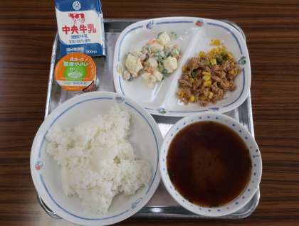 ツナそぼろ丼、みそ汁(備蓄用)、じゃがいもと大豆のサラダ、野菜ゼリー、牛乳 でした。