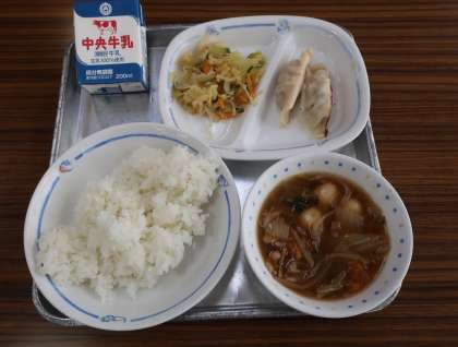 9/9 今日の給食 公開日 2024/09/09 更新日 2024/09/09 特別活動 今日の献立は ————— 八宝菜、拌三絲(バンサンスー)、ぎょうざ、ごはん、牛乳 でした。 *エネルギー:815kcal たんぱく質:29.4g