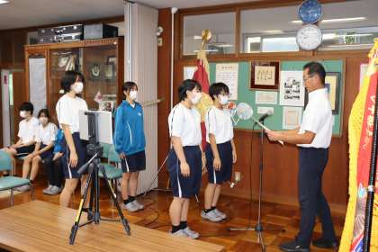 集会の前半は、この夏の部活動などの大会で優秀な成績を残した生徒たちの表彰伝達が行われました。