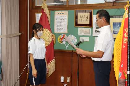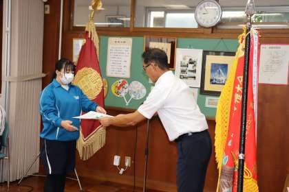 集会の前半は、この夏の部活動などの大会で優秀な成績を残した生徒たちの表彰伝達が行われました。