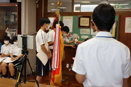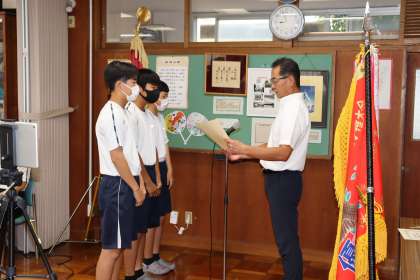 集会の前半は、この夏の部活動などの大会で優秀な成績を残した生徒たちの表彰伝達が行われました。