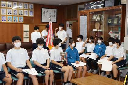 集会の前半は、この夏の部活動などの大会で優秀な成績を残した生徒たちの表彰伝達が行われました。
