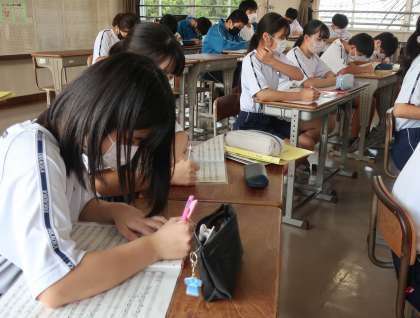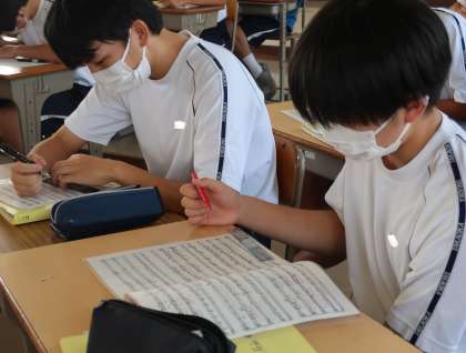 合唱コンクールで発表する曲のポイントを一生懸命書き込んでいました。