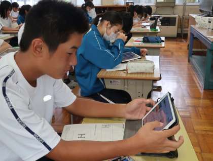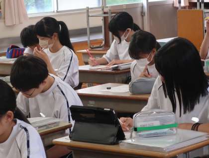 9/9 1-2 レタリングを生かした作品 3 公開日 2024/09/09 更新日 2024/09/09 各学年から 1年2組の美術の授業の様子です。 レタリングを学び、それを生かした作品づくりに取り組んでいました。