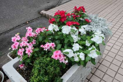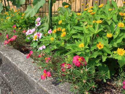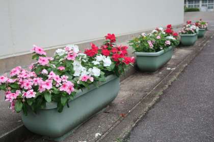 9月に入っても厳しい暑さが続いていますが、花壇の草花たちは元気に咲いています。夏休み前と夏休み中の二度にわたってカットしましたが、本当にその生命力に感心させられます。