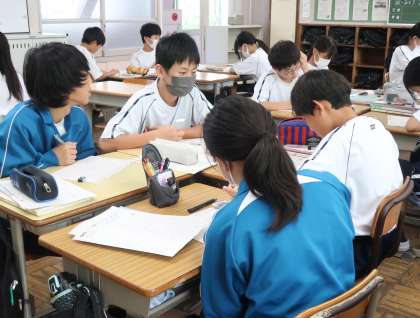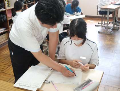 9/10 1-2 明日からのテストに備える 3 公開日 2024/09/10 更新日 2024/09/10 各学年から 1年2組の数学の授業の様子です。 解き方に不安がある問題を仲間や先生に教えてもらって明日に備えています。