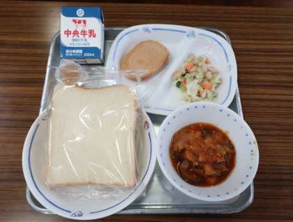 ラタトゥイユ、ビーンズサラダ、とよたひまわりポーク入りハムサンド(スライスパン)、ももゼリー、牛乳 でした。