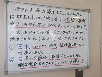 テストが返却される今週、結果としっかり向き合い、今後の学習や生活、特に合唱コンクールなどの行事につなげることの大切さが記されています。