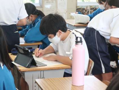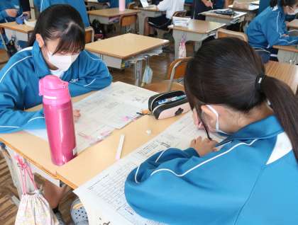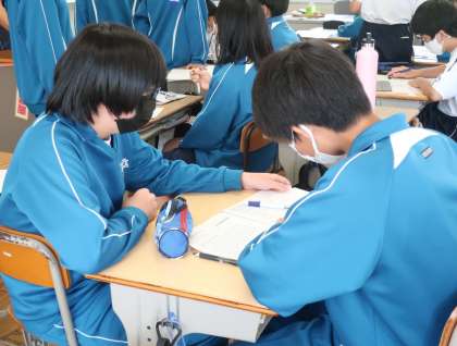 テストが返却されました。間違えた問題や理解が不十分だと思われる問題の解き方・考え方を仲間に確認していました。