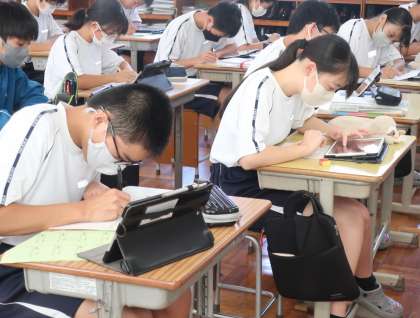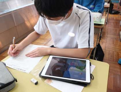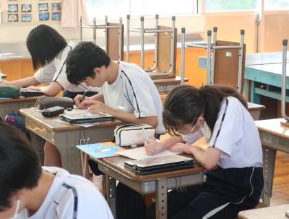 これまで取り組んできた空想画の作品について、目に留まった仲間の作品の良いところや自身の作品のPRポイントを書き出していました。