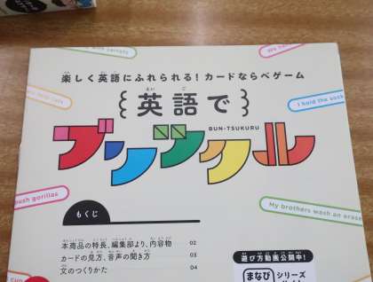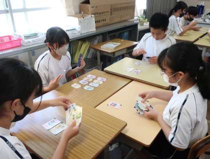 「英語でブンツクル」というカードゲームを使い、いろいろなパターンの英文を作る学習にグループで楽しみながら取り組んでいました。