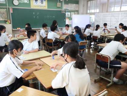 「英語でブンツクル」というカードゲームを使い、いろいろなパターンの英文を作る学習にグループで楽しみながら取り組んでいました。