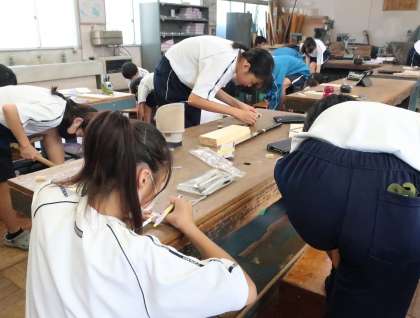 今後取り組んでいく木工作品の制作を前に、のこぎりの使い方について知識と技能を学んでいました。