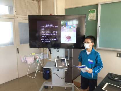 体験の様子をまとめた2年生一人一人が、1年生に向けて自作のパワーポイントを使って発表しています。