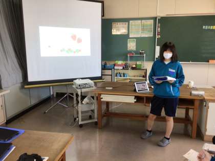 体験の様子をまとめた2年生一人一人が、1年生に向けて自作のパワーポイントを使って発表しています。