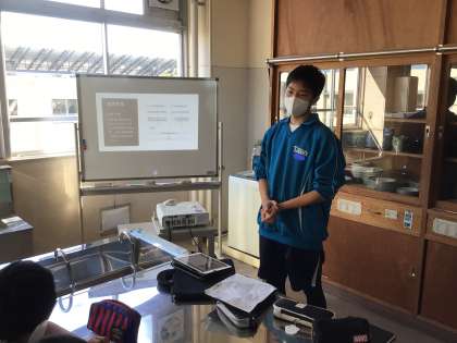 体験の様子をまとめた2年生一人一人が、1年生に向けて自作のパワーポイントを使って発表しています。
