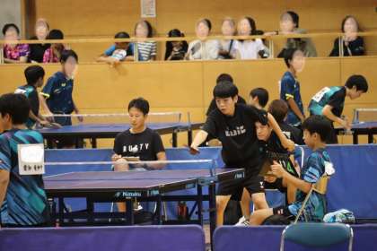 写真は、豊田市運動公園体育館で行われた卓球部・団体の大会の様子です。