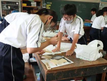 木工作品制作を前に、仲間と協力してきりの使い方を学んでいました。
