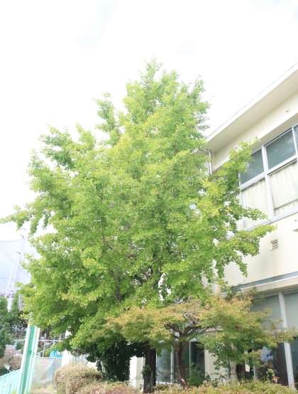 3年生の昇降口付近に植わるイチョウの木。葉はまだまだ緑色ですが、よく見ると実がつき始めていました。そう、「銀杏(ぎんなん)」です。