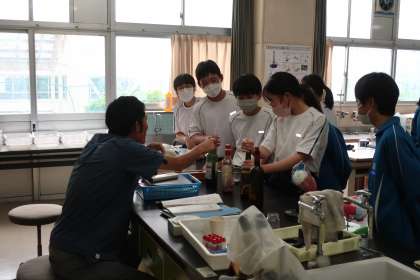 「沸点のちがいを利用して、赤ワインからエタノールを取り出してみよう」をテーマに実験が行われていました。