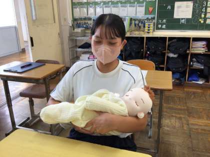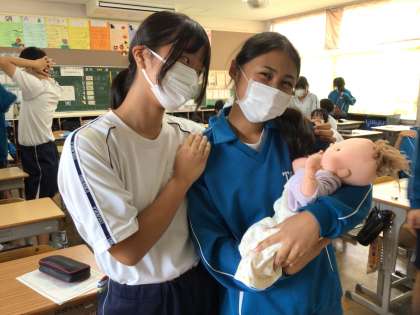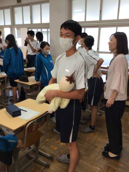 生徒は、胎児の大きさの模型を見たり、赤ちゃん人形の抱っこ体験を行ったりしながら、命の大切さや責任をもった行動の重要性を実感するとともに、これからの人生について考えを深めました。
