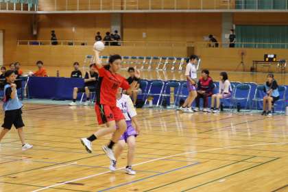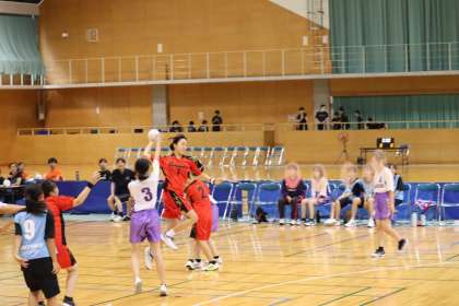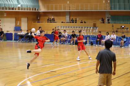 写真は、豊田市運動公園体育館で行われた女子ハンドボール部の大会の様子です。笑顔でのプレーを忘れず練習の成果を発揮し、準優勝の輝きました。