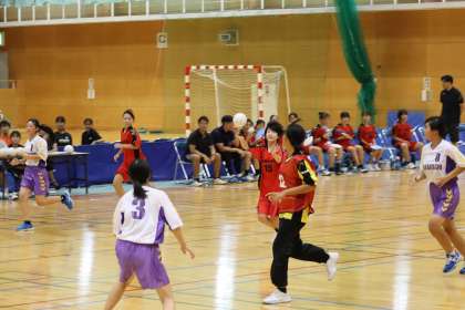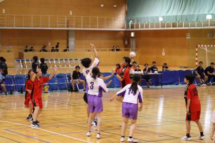 写真は、豊田市運動公園体育館で行われた女子ハンドボール部の大会の様子です。笑顔でのプレーを忘れず練習の成果を発揮し、準優勝の輝きました。