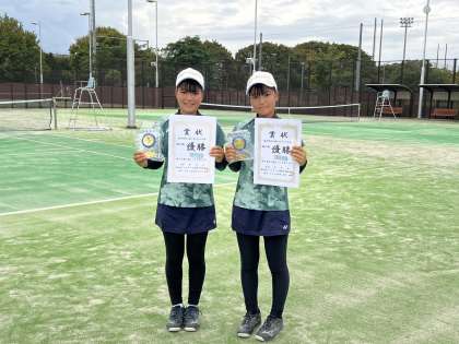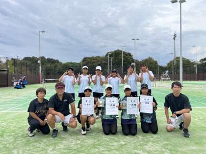 写真は、柳川瀬公園テニスコートで行われたソフトテニス部の大会の様子です。団体で5位、個人では優勝に輝きました。